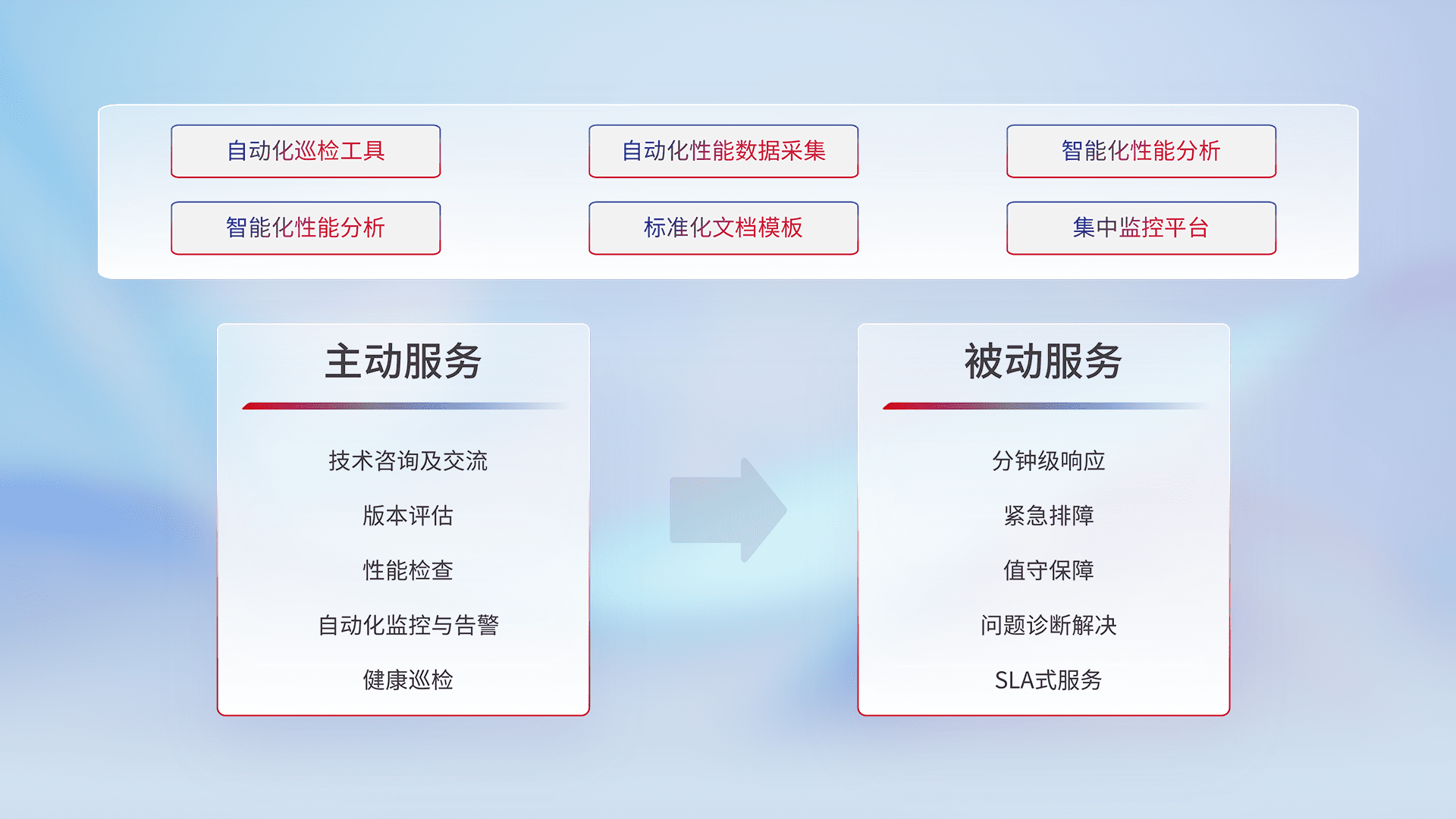 智能化工具和标准化文档,,,,保障服务质量,,,提供主动服务(包含技术咨询、、、、版本评估、、、、性能检查、、、自动化监控与告警、、健康巡检)和被动服务包含(分钟级响应、、紧急排障、、值守保障、、、、问题诊断解决、、、、SLA服务)。。。。